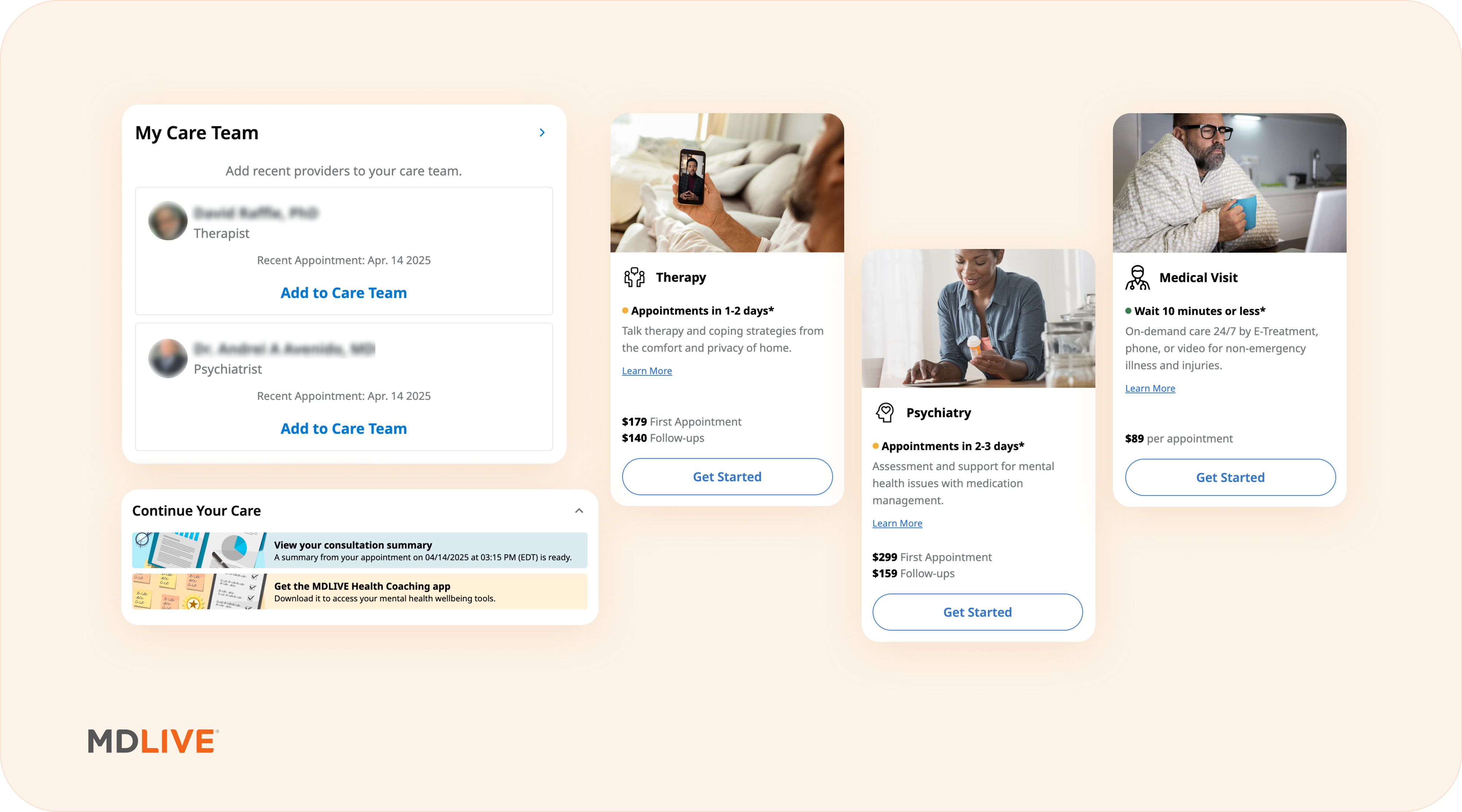 MD Live is a telehealth platform that offers medical care as well as mental health care (both therapy and psychiatry) across the United States. The platform accepts major insurance plans such as Cigna, Humana, Blue Cross/Blue Shield, and Aetna. Instead of matching you with a therapist, it allows you to choose from a list of providers fitting your preferences.