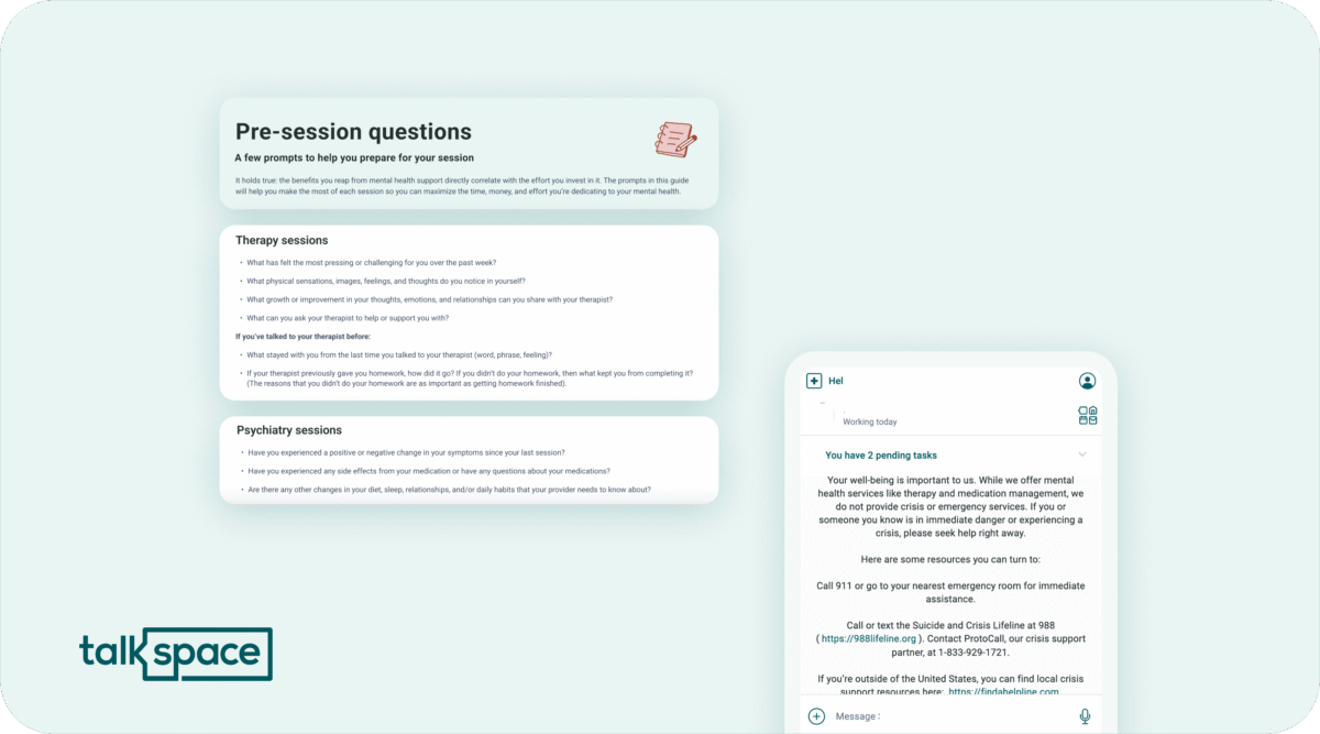 To thoroughly review the platform, we surveyed over 200 real Talkspace users in May and June, 2025 and one of our staff members conducted hands-on testing for one month. Our staff tester attended weekly online therapy sessions and had an initial consultation with a psychiatry provider. Our tester also messaged both providers, contacted customer service, and tried out all the extra features offered on the platform, such as live workshops and assessment and tracking tools.